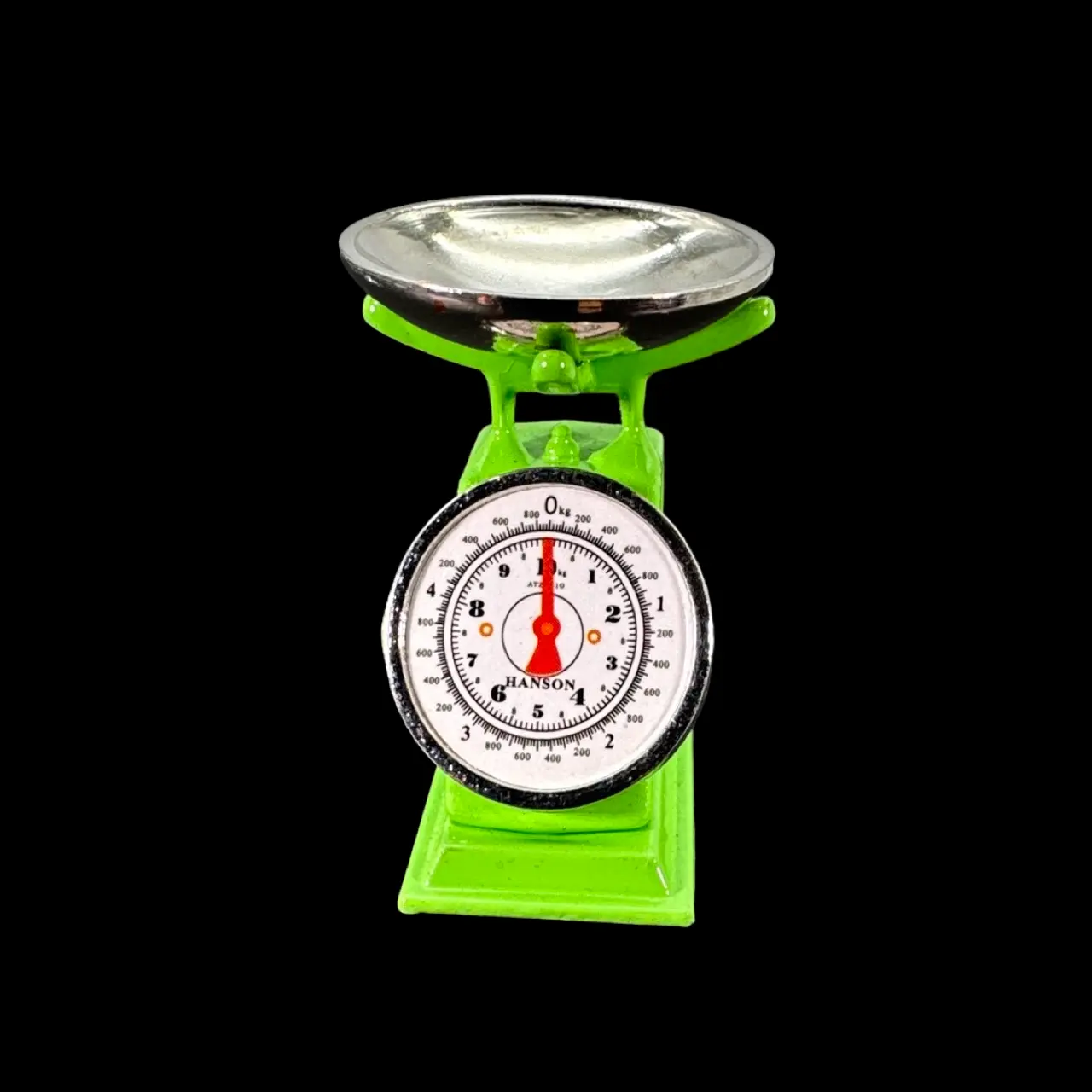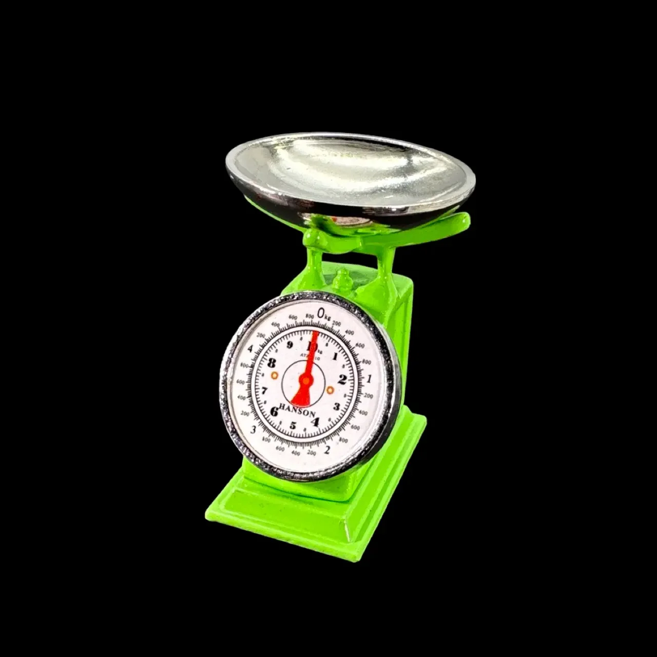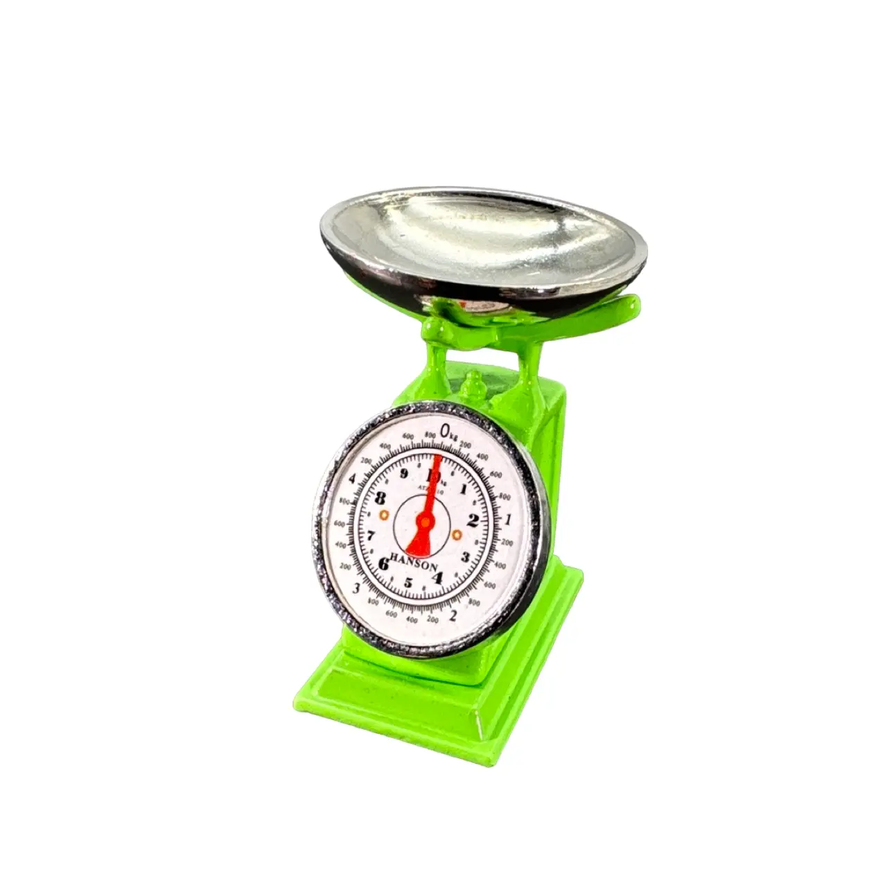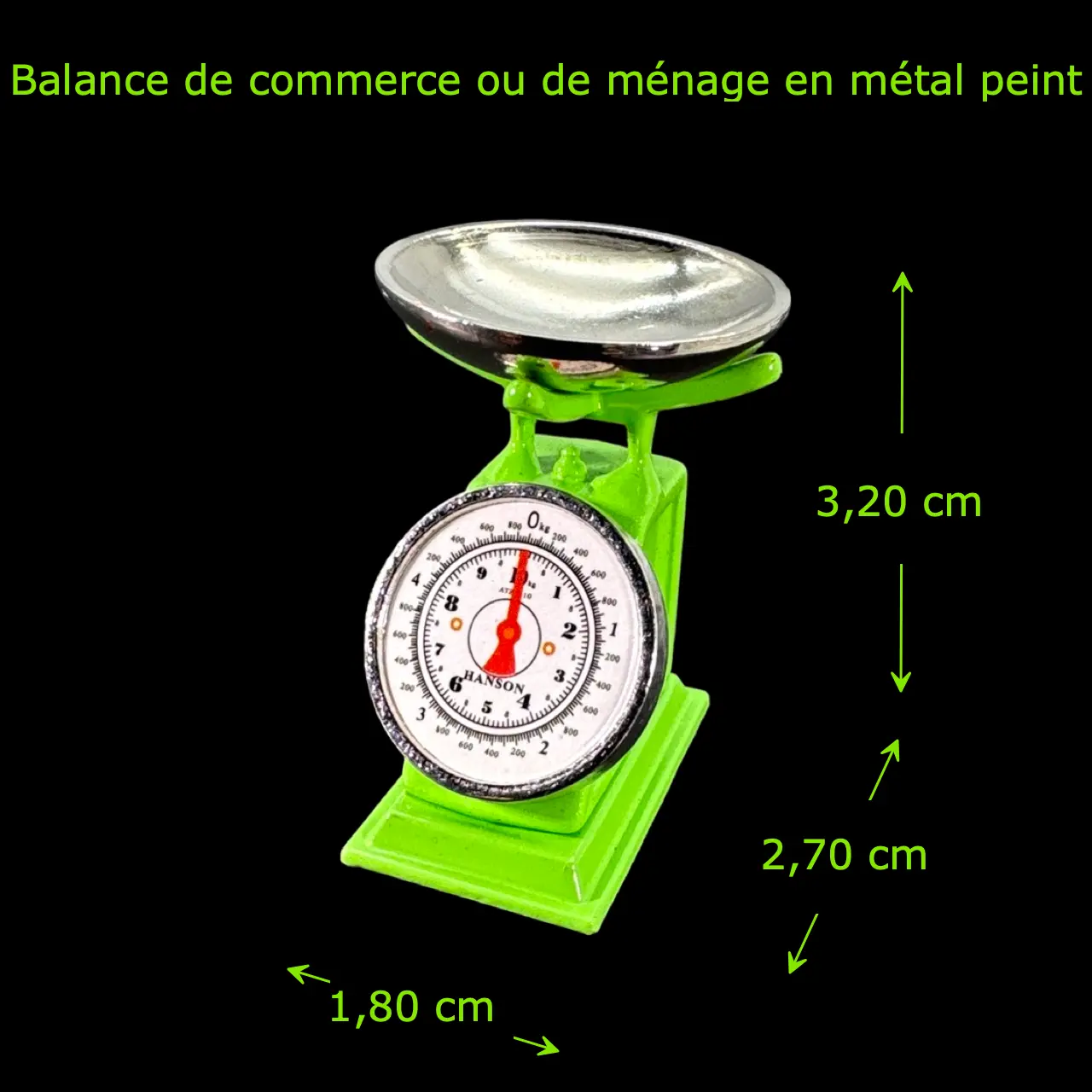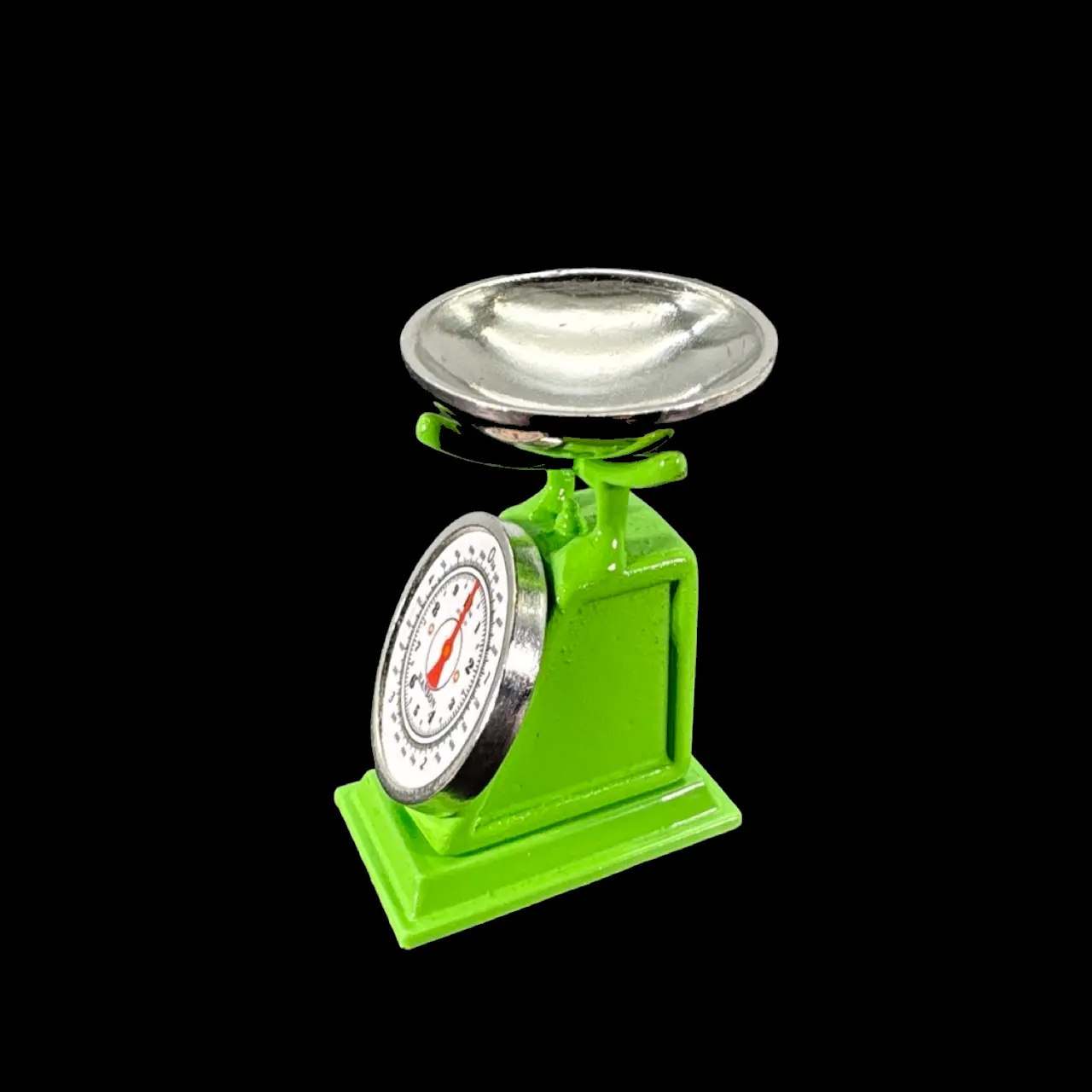 Construction en métal peint soigné, coloris vert vif. Plateau supérieur amovible en métal poli pour disposer fruits, pains ou poids miniatures. Cadran imprimé lisible, aiguilles contrastées, base élargie pour une tenue impeccable. Proportions réalistes à l’échelle 1/12ᵉ. La Balance de ménage n’est pas fonctionnelle : elle sert de pièce décorative, robuste et durable.