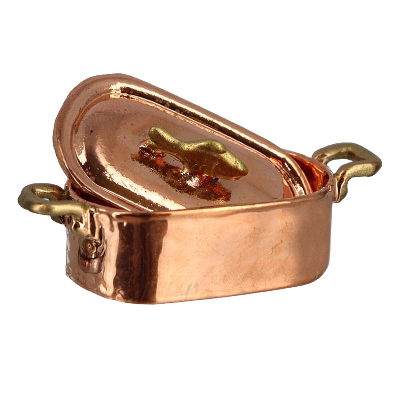 Cette poissonnière en cuivre se distingue par ses finitions impeccables et sa robustesse. Le matériau principal, le cuivre, est non seulement esthétique, mais aussi durable, garantissant une longue durée de vie à cet accessoire miniature. Le couvercle amovible ajoute une dimension interactive, permettant de simuler la préparation de délicieux plats. Les poignées en laiton offrent une prise en main facile et un contraste élégant avec le cuivre.