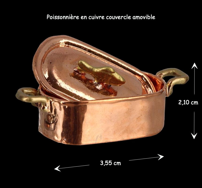 Découvrez la magnifique poissonnière en cuivre, conçue spécialement pour les maisons de poupée. Ce petit bijou est idéal pour les amateurs de miniatures et les collectionneurs passionnés. Réalisée avec une grande attention aux détails, cette poissonnière apporte une touche d’élégance et d’authenticité à toute cuisine miniature. Avec son couvercle amovible orné d’un poisson, elle est l’accessoire parfait pour enrichir votre collection et apporter du réalisme à vos scènes miniatures.
