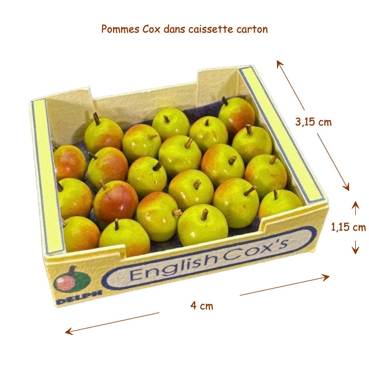 Ces pommes Cox miniatures, soigneusement disposées dans une caissette en carton imprimée, sont idéales pour recréer des scènes réalistes dans vos maisons de poupées à l’échelle 1:12. Chaque pomme est fabriquée avec un grand souci du détail, imitant parfaitement la couleur et la texture des vraies pommes Cox. La caissette en carton ajoute une touche d’authenticité, parfaite pour des décors de marché ou des cuisines miniatures.