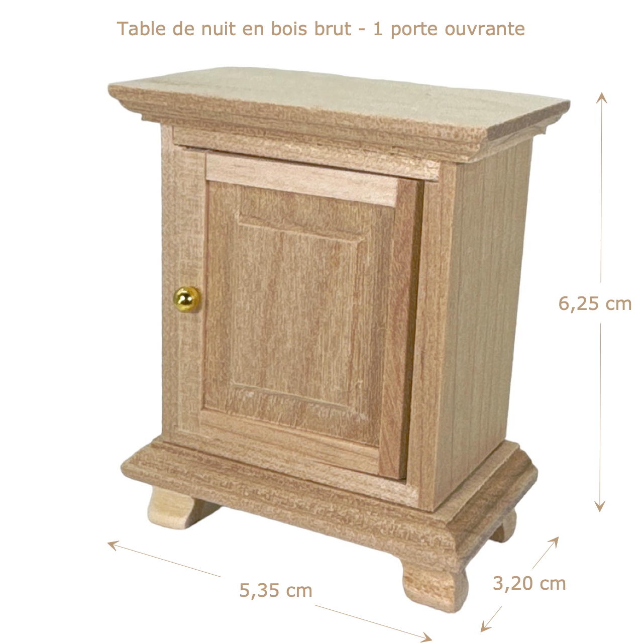 Offrez à votre espace miniature cette jolie table de nuit en bois brut, un indispensable pour toute chambre de maison de poupée à l’échelle 1:12. Avec son bois non verni et sa poignée doré délicate, elle allie simplicité et élégance.