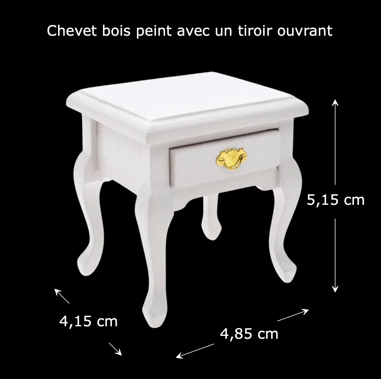 Ce chevet est fabriqué en bois massif, peint dans un blanc doux et lumineux. Son tiroir s’ouvre vraiment, ce qui ajoute du réalisme et permet de petits rangements (bijoux miniatures, lettres, livres, etc.). Chaque détail est minutieusement réalisé, du galbe des pieds à la poignée en métal doré.