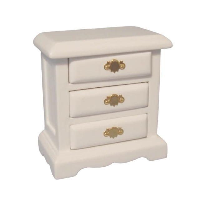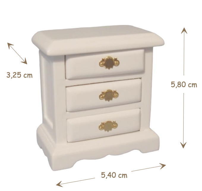 Cette table de chevet miniature en bois peint de coloris blanc, est un meuble raffiné, parfait pour compléter une chambre de maison de poupée. Avec ses trois tiroirs fonctionnels et son design classique, elle incarne l’élégance et le réalisme à l’échelle 1:12ᵉ.