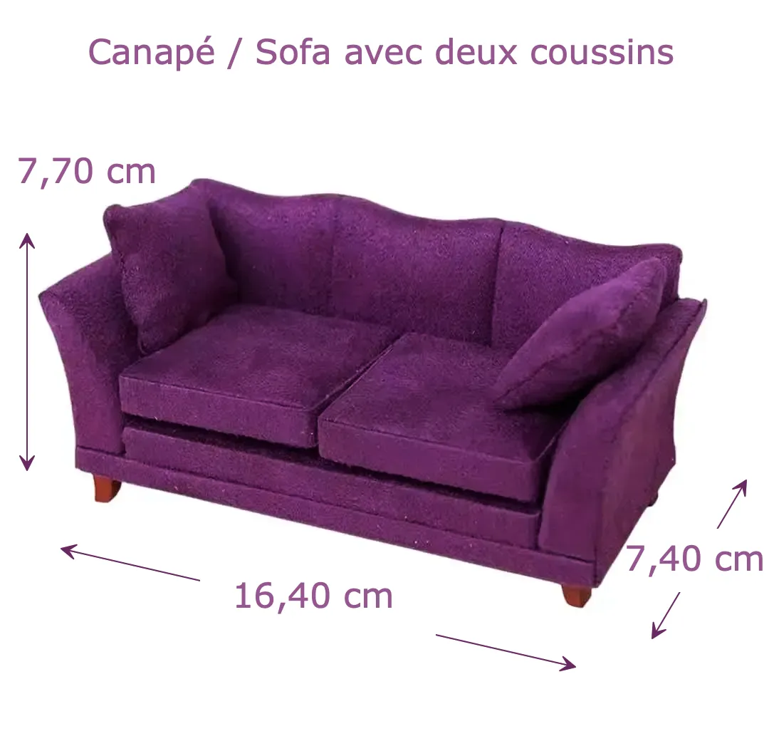 Apportez une touche d’élégance et de confort à votre maison de poupée avec ce magnifique canapé miniature de couleur violet foncé / Aubergine. Ce modèle raffiné se distingue par sa forme courbée, son assise moelleuse amovible et ses deux coussins assortis. Idéal pour aménager un salon miniature avec style, il devient vite un élément incontournable dans tout décor raffiné à l’échelle 1/12e.