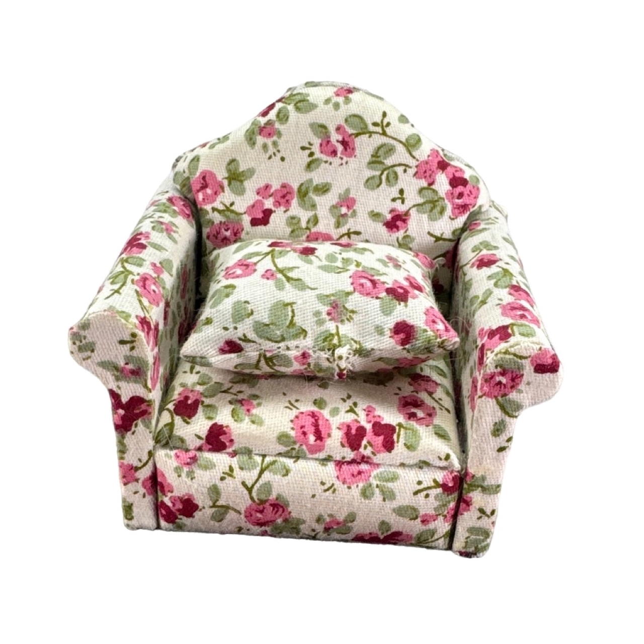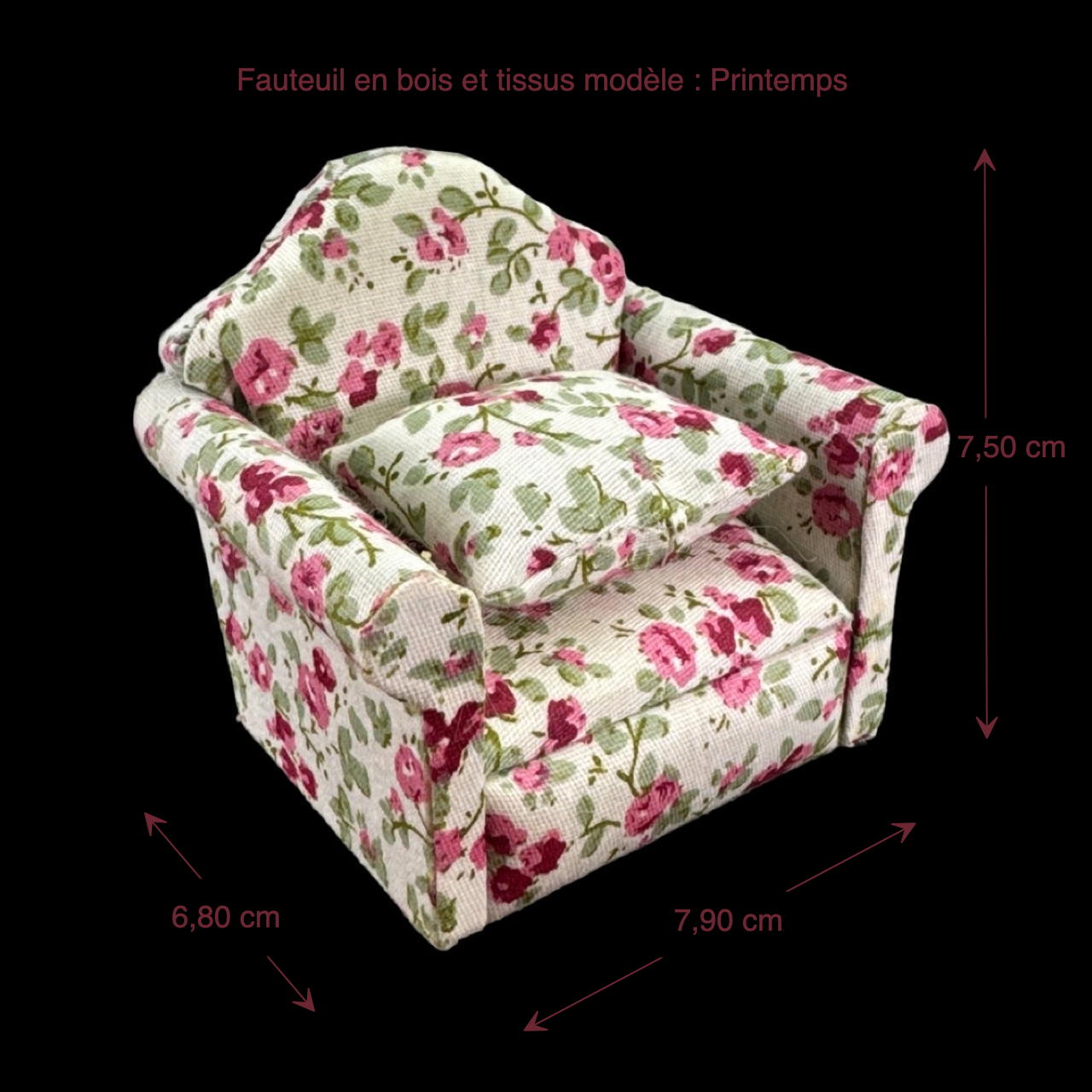 Ce fauteuil tissu fleuri s’intègre parfaitement dans un salon miniature au style classique, shabby chic ou romantique. Associez-le à un canapé assorti pour créer un espace cosy et harmonieux. Ajoutez une table basse et un tapis miniature pour renforcer l’atmosphère chaleureuse. Pour une mise en scène encore plus réaliste, disposez un livre miniature, une tasse de thé ou un petit bouquet de fleurs à côté.