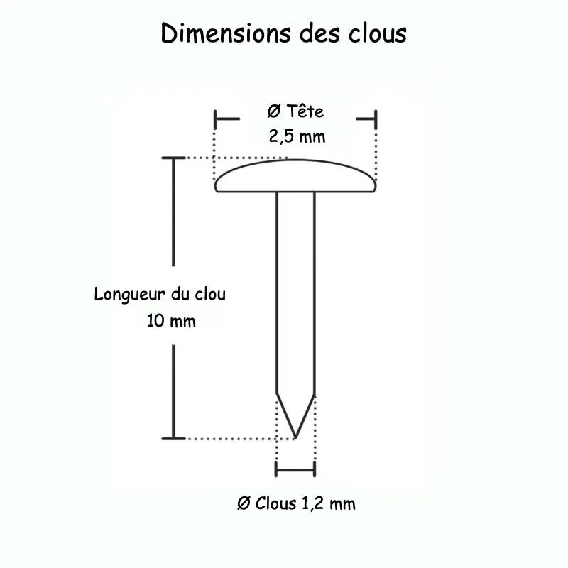 Dimensions : Longueur : 10 mm – Diamètre du clou : 1,2 mm – Diamètre de la tête : 2,5 mm