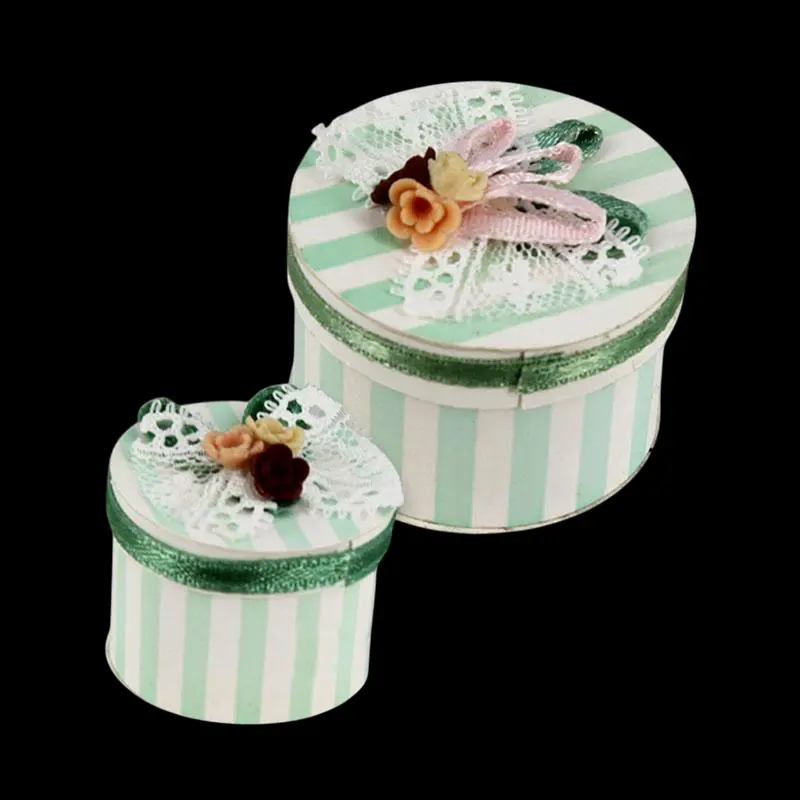 Ces boîtes à chapeaux miniatures complètent parfaitement l’aménagement d’une maison de poupée à l’échelle 1/12ᵉ. Leur design raffiné, avec des rayures vert tendre et blanc, apporte charme et réalisme. La décoration florale délicate sur le couvercle renforce leur style élégant. Elles s’intègrent facilement dans de nombreux univers miniatures.